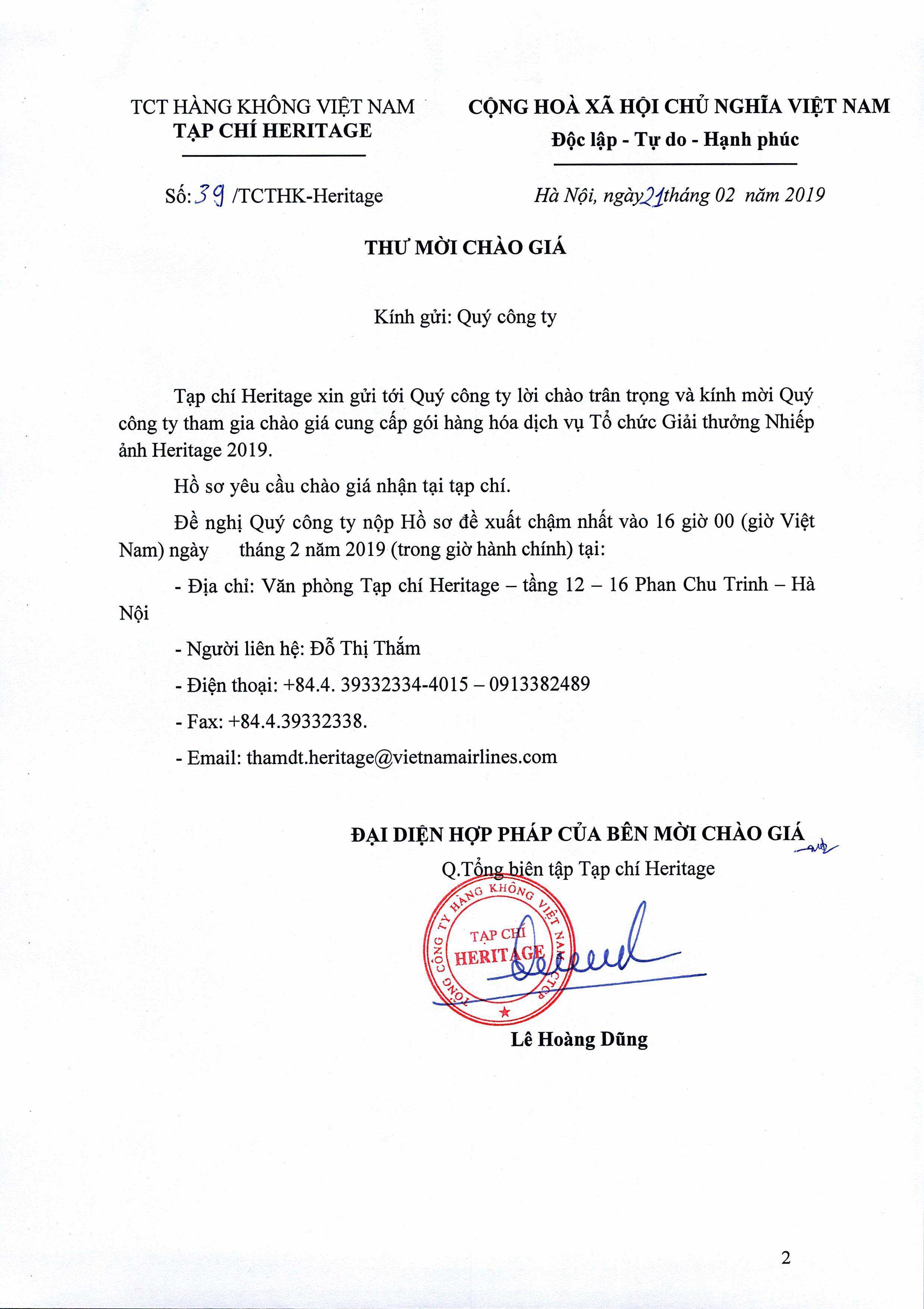 Tổng công ty Hàng không Việt Nam - Tạp chí Heritage triển khai mua sắm gói dịch vụ "Tổ chức Giải thưởng Nhiếp ảnh Heritage 2019". Kính mời các đối tác, nhà cung cấp tham gia chào giá. Thông tin gói dịch vụ cũng như chi tiết liên hệ với Tổng công ty Hàng không Việt Nam - Tạp chí Heritage được đính kèm tại đây.