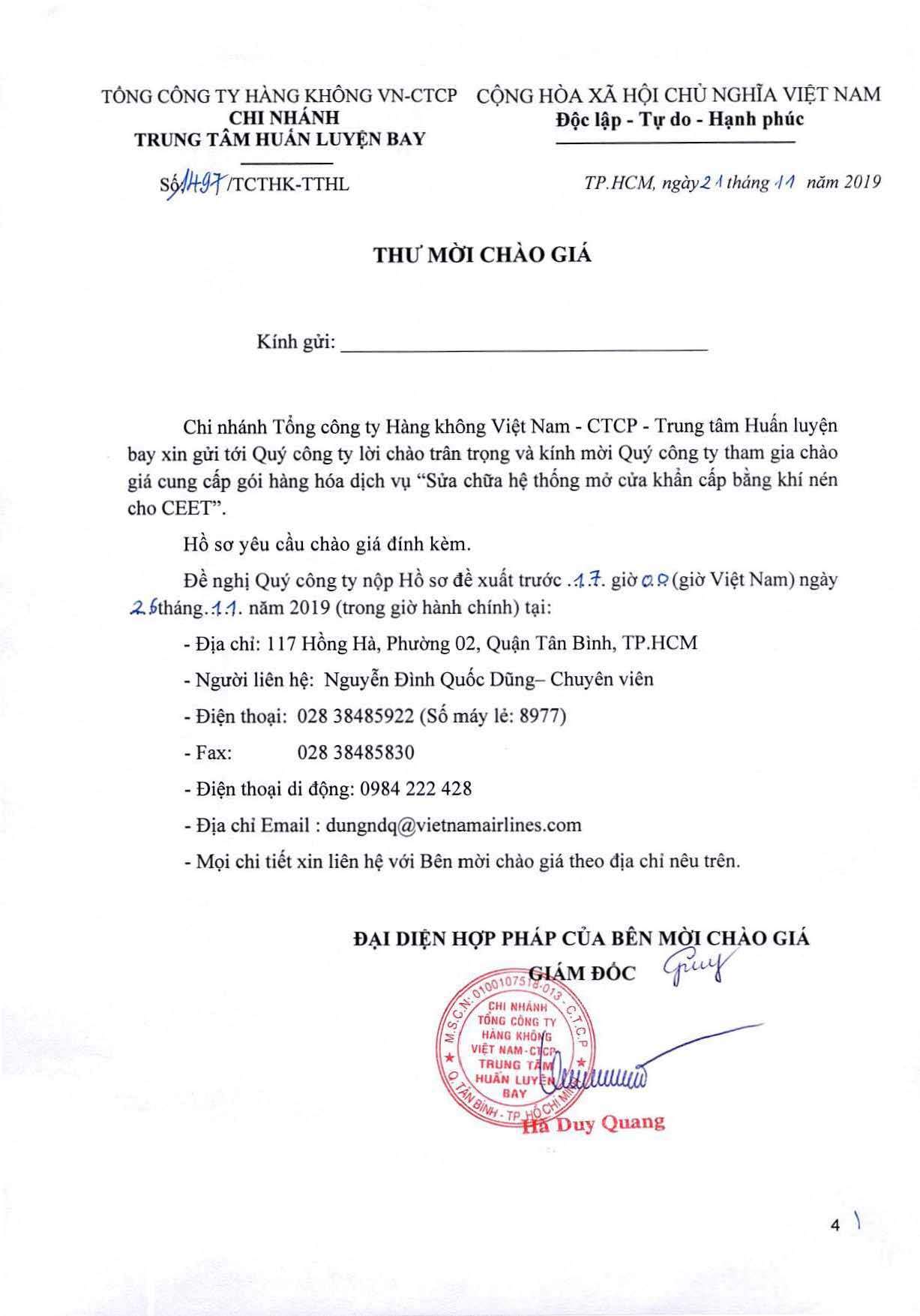 Trung tâm Huấn luyện bay xin gửi Thư chào giá gói hàng hóa dịch vụ “Sửa chữa hệ thống mở cửa khẩn cấp bằng khí nén cho CEET”.