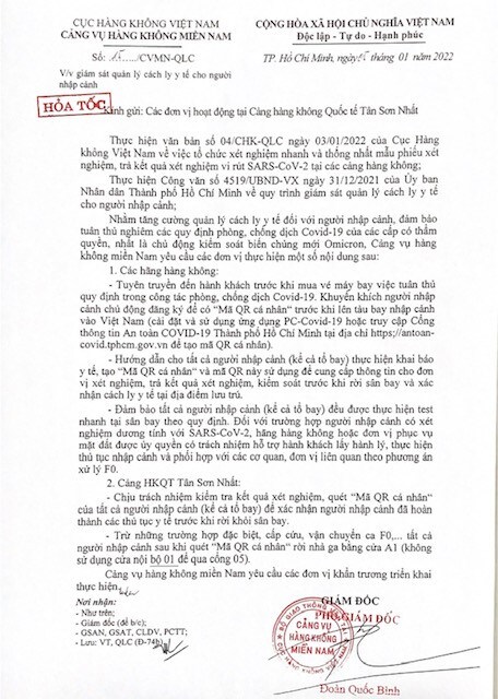 Công văn số 15/CVMN-QLC ngày 05/01/22 về việc quản lý cách ly y tế cho người nhập cảnh tại Cảng hàng không quốc tế Tân Sơn Nhất, chi tiết tại đây.