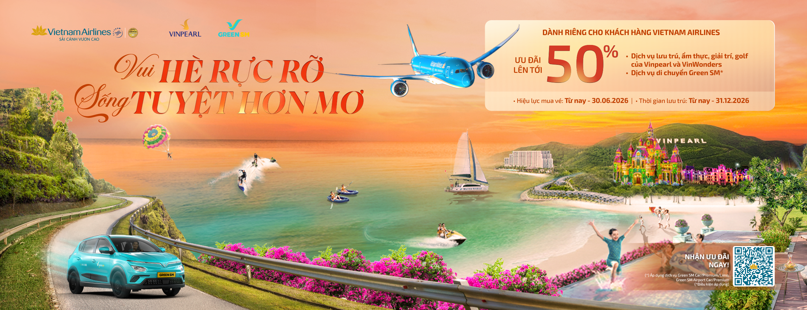 Vietnam Airlines hân hạnh đồng hành cùng Vinpearl, VinWonders, Vinpearl Golf và Green SM, mang đến chuỗi ưu đãi độc quyền giảm giá lên đến 50%. Biến mỗi chuyến bay của Hãng trở thành chiếc vé vàng để bạn tận hưởng trọn vẹn mọi trải nghiệm từ nghỉ dưỡng sang trọng, vui chơi giải trí bất tận, chơi Golf đẳng cấp, đến di chuyển tiện lợi, thân thiện với môi trường.